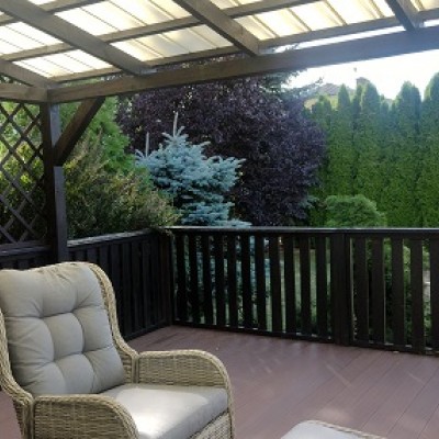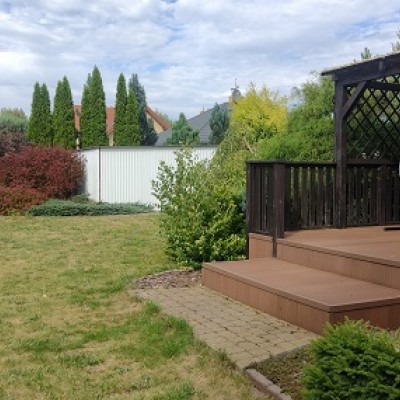 Dom o powierzchni 120 m2 wykończony w wysokim standardzie z pięknym ogrodem, w którym znajduje się zabudowany taras, z widokiem na ogród pełen pięknych drzew.