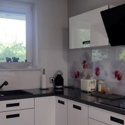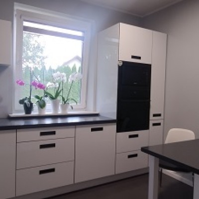 Kuchnią z meblami wykonanymi na wymiar, pełnym wyposażeniem AGD: płyta, zmywarka, piekarnik, lodówka.